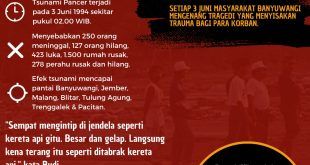 Tragedi tsunami yang menyapu pesisir pantai Pancer, Kabupaten Banyuwangi 30 tahun lalu tidak terasa telah melalui waktu panjang. Tepatnya pada 3 Juni 1994 pesisir pantai selatan Banyuwangi, dan terpusat di Dusun Pancer, Desa Sumberagung, Kecamatan Pesanggaran yang paling parah dampaknya. Tercatat bencana alam itu terjadi pada pukul 02.00 WIB. Diperkirakan ada 250 orang meninggal dunia akibat kejadian itu. Melansir dari …